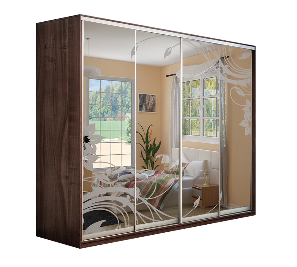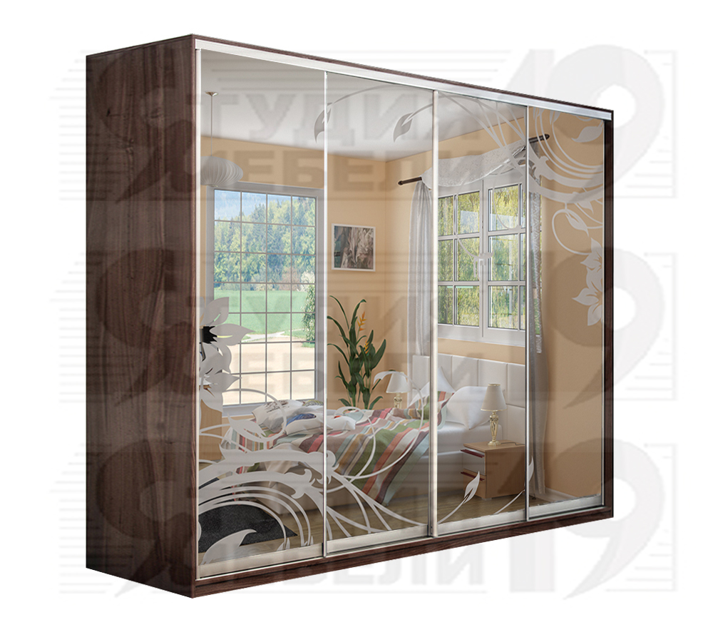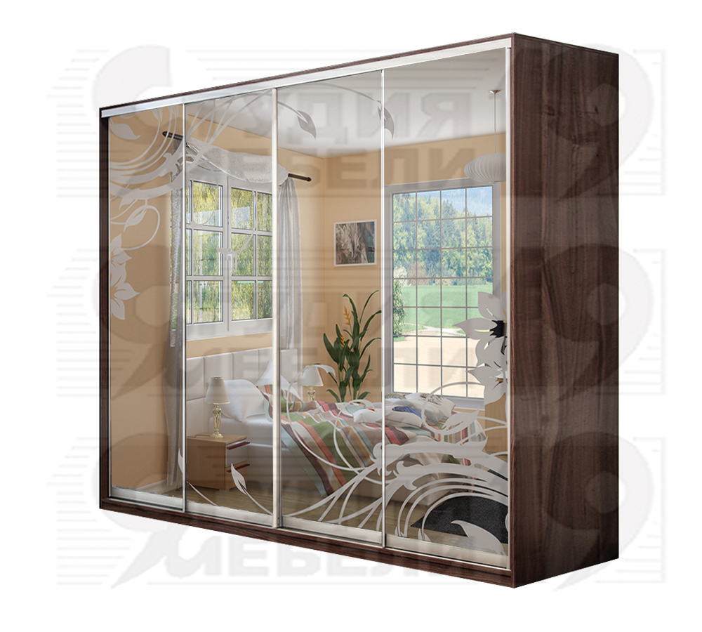 Четыре створки Зеркало Серебро c пескоструйным рисунком Ш 2600-3000 В 2200-2600 Г 450/600 Вместительный, функциональный шкаф купе выполнен из высококачественных, экологически чистых материалов европейского и Российского производства. Шкаф купе может быть как отдельно стоящим так и встроенным, его возможно разместить в любом месте: в прихожей, комнате, спальне, балконе, и т.д. — это является основным и самым большим плюсом шкафа купе. Представленная модель может быть выполнена по индивидуальным размерам.