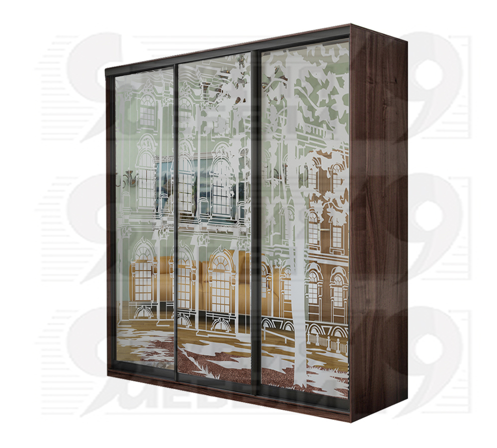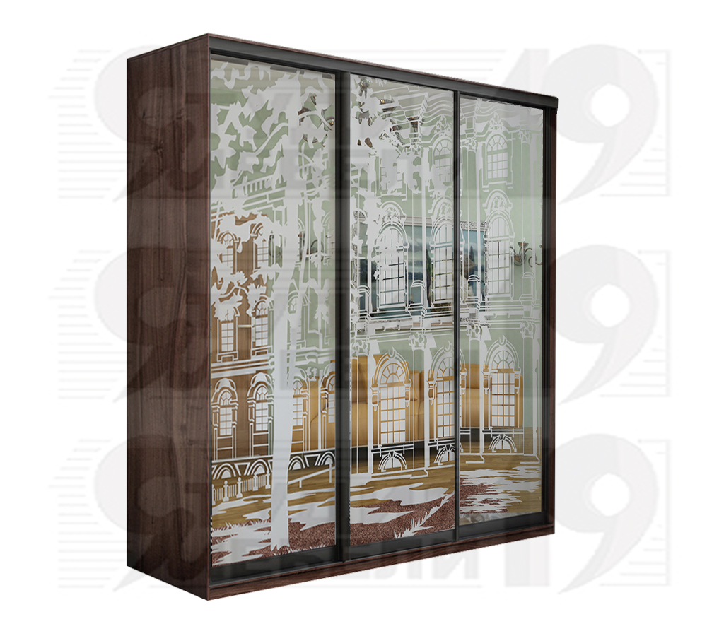 Три створки Зеркало Серебро c пескоструйным рисунком Ш 2100-2500 В 2200-2600 Г 450/600 Вместительный, функциональный шкаф купе выполнен из высококачественных, экологически чистых материалов европейского и Российского производства. Шкаф купе может быть как отдельно стоящим так и встроенным, его возможно разместить в любом месте: в прихожей, комнате, спальне, балконе, и т.д. — это является основным и самым большим плюсом шкафа купе. Представленная модель может быть выполнена по индивидуальным размерам.