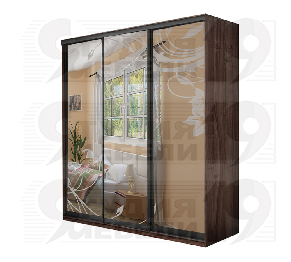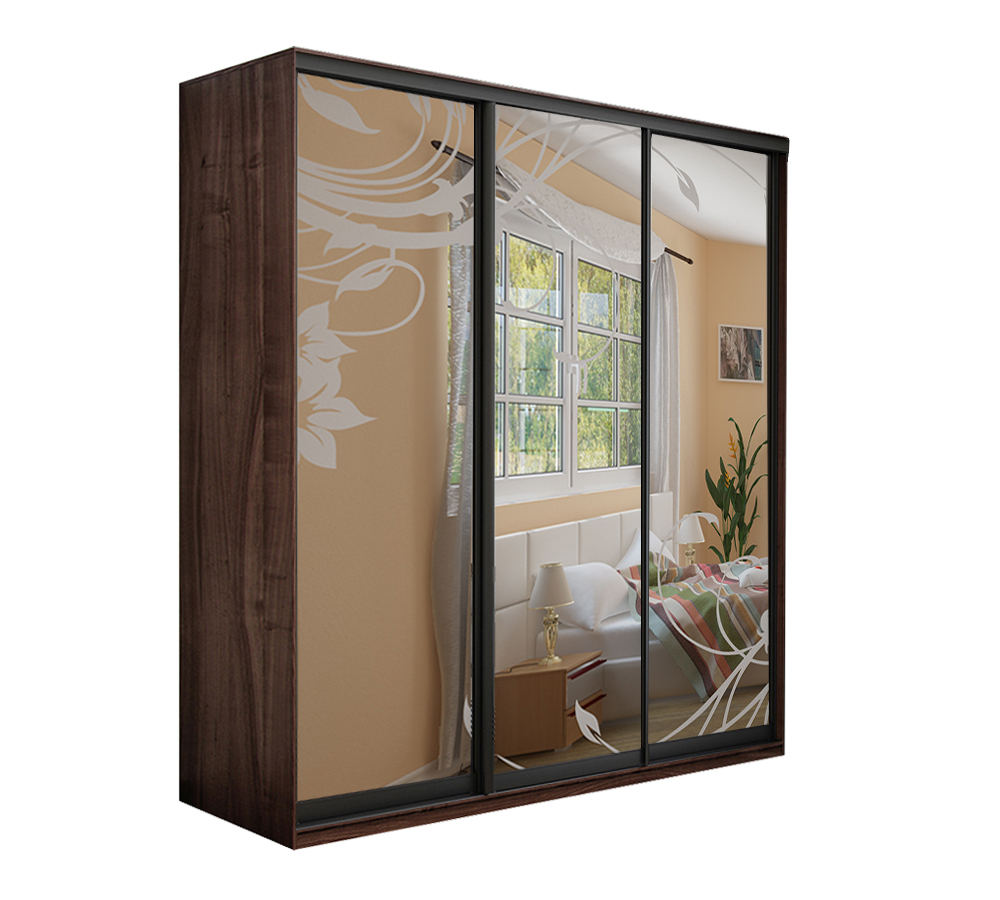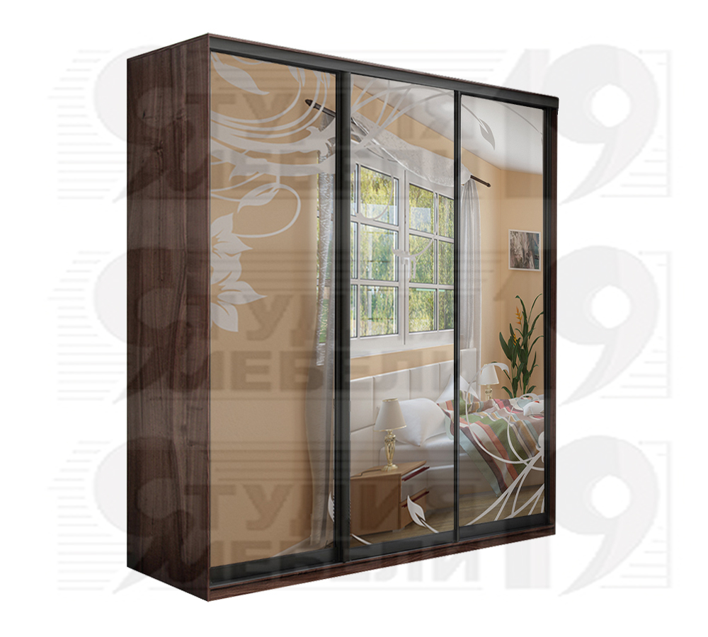 Три створки Зеркало Серебро c пескоструйным рисунком Ш 2100-2500 В 2200-2600 Г 450/600 Вместительный, функциональный шкаф купе выполнен из высококачественных, экологически чистых материалов европейского и Российского производства. Шкаф купе может быть как отдельно стоящим так и встроенным, его возможно разместить в любом месте: в прихожей, комнате, спальне, балконе, и т.д. — это является основным и самым большим плюсом шкафа купе. Представленная модель может быть выполнена по индивидуальным размерам.